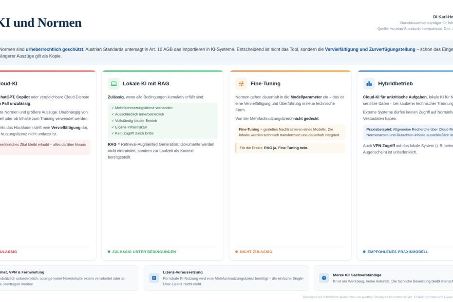 Was Sachverständige über die Nutzung österreichischer Normen in KI-Systemen wissen müssen Einleitung Sachverständige arbeiten täglich mit Normen. Sie zitieren daraus, leiten technische Bewertungen ab und argumentieren auf ihrer Grundlage vor Gericht. Gleichzeitig verändert Künstliche Intelligenz die Art, wie Fachleute mit großen Textmengen arbeiten. Die Frage liegt nahe: Darf man Normen in KI-Systemen verwenden? Die Antwort ist differenzierter als ein pauschales… Mehr lesen »Normen und KI